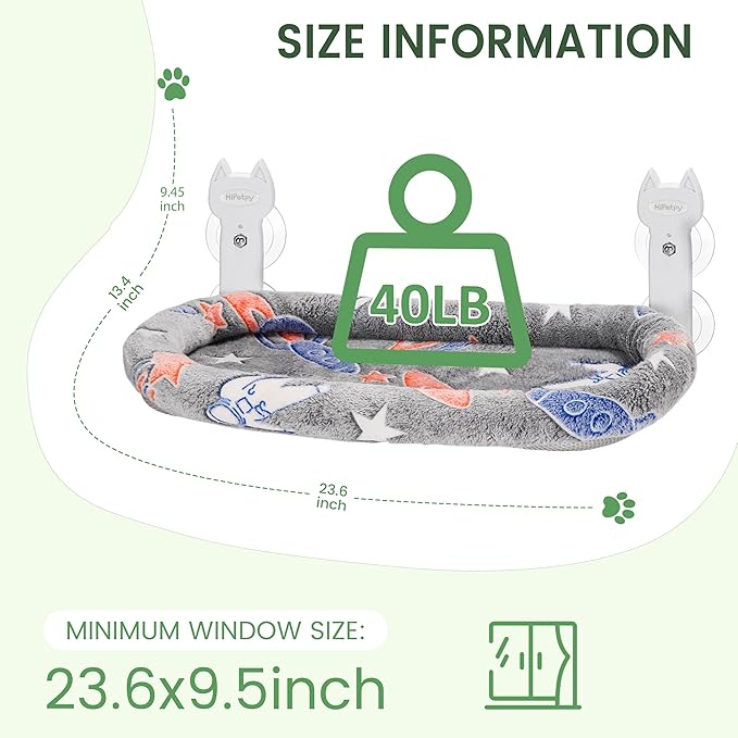 - 【Cordless Cat Hammock】 HiPetpy cat window perch measures 23.6 x 13.4 x 9.45 inches and supports cats weighing up to 40 lbs. Its cordless installation allows your cat to jump up and down freely.