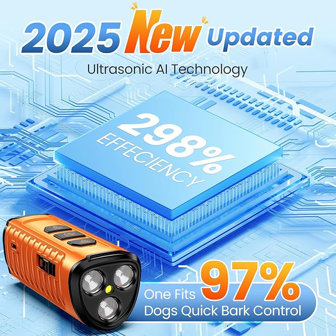 - 3X Fast, Humane, No Barking:Using triple ultrasonic emitters, this ultrasonic dog training device stops unwanted behaviors like barking, chewing, or biting quickly and effective. The alternating 25kHz fixed and 22–29kHz variable frequencies keep dogs from tuning it out. No pain, no harmful— Barks no more made easy. For best results, aim the device directly at your dog within 50ft. Ideal for dogs from 6 months to 8 years without hearing impairments: Not recommended for dogs with known neurological disorders, including epilepsy or seizures