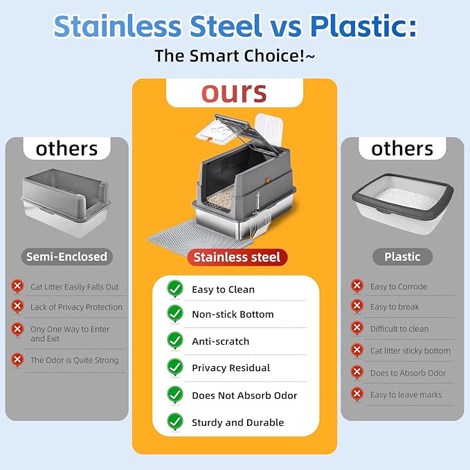 - 【155° Flip Lid for Effortless Maintenance】Upgrade your routine with the 155° flip-top lid—scoop litter without removing the entire cover! The smooth stainless steel surface and modular design enable quick wipe-downs, while the detachable tray ensures thorough sanitization.