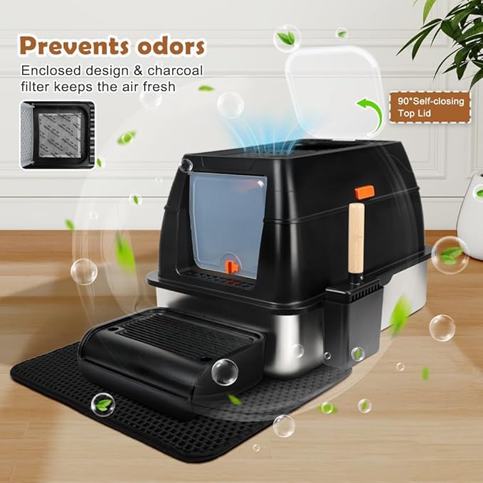 - INCLUDES ESSENTIAL ACCESSORIES - The package contains an oversized stainless steel litter box, litter scoop, footboard, honeycomb mat, slip-resistant pads, charcoal filter, and instructions. The footboard helps kittens and seniors access the box, while the double-layer honeycomb mat traps stray litter, ensuring a clean floor
