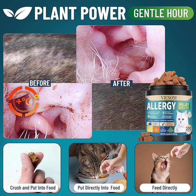- Immune Support, Day After Day - Recurring flare-ups are frusstrating, driving the need for dependable allergy for cats relief. Our unique blend goes beyondmasking sensitivities, supporting year-round comfort including seasonal allergy relief for cats from food, pollen, and dust mites. Less time managing reactions means more happy days together.