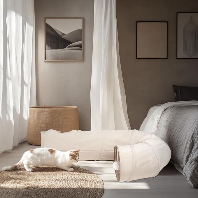 Cat Tunnel, 2-Way Collapsible Cat Tube with Interactive Peek-A-Boo Hole, Toy Ball, and Rope – Ideal for Indoor Cats, Kittens, and Rabbits, Beige