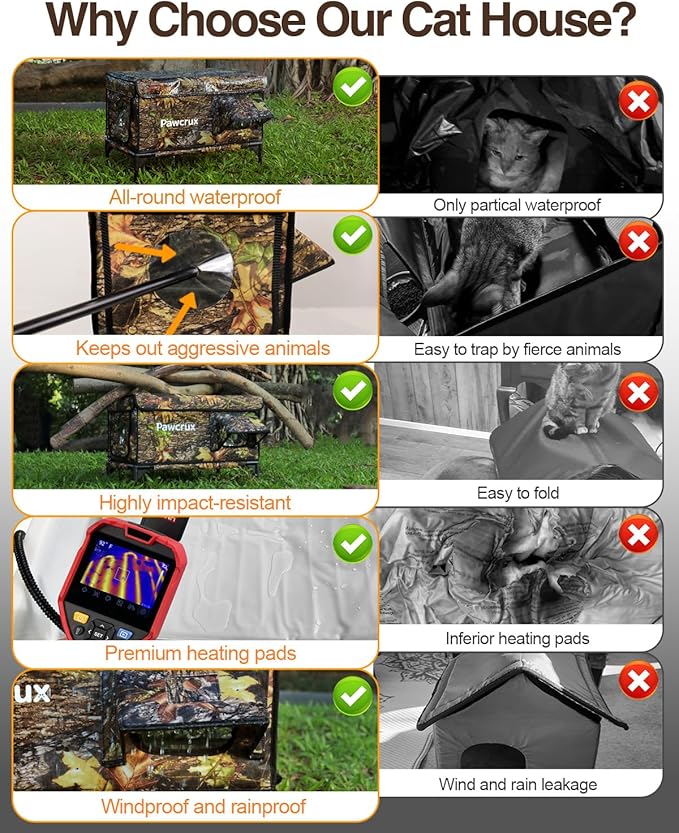 - ๐ช๐ถ๐ป๐ฑ ๐ฎ๐ป๐ฑ ๐ฅ๐ฎ๐ถ๐ป ๐ฅ๐ฒ๐๐ถ๐๐๐ฎ๐ป๐: The elevated, off-ground design of this heated cat bed outdoor prevents moisture buildup. Its heating pad outlet, eaves, roof, and escape door are all waterproof, built to withstand wind and rain. This fully weatherproof heated cat house ensures that your catโs environment remains dry and comfortable.