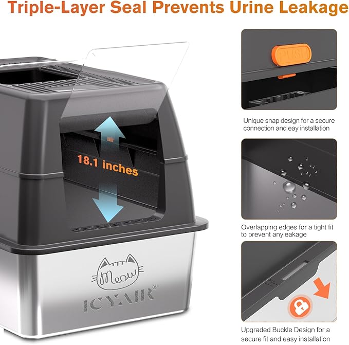 - 【Leak-Proof Extra Large Litter Box with Cover】Our stainless steel litter box is designed with 3-piece secure system: 18.1"high walls+overlap sealing+secured cover, which eliminates all leaks, contain any accidents, even the messiest diggers. Say goodbye to unsightly puddles on the floor or the box.