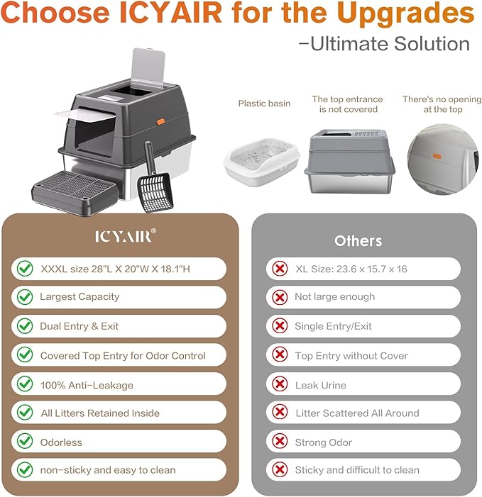 - 【Dual-Modes & Dual-Entry Metal Litter Box】ICYAIR stainless steel litter box offers two smart configurations for versatility to adapts to all cats' habits. The enclosed mode provides privacy, contains litter scatter, and traps odors for a cleaner home.The semi-open mode ideal for cats who prefer open spaces and makes scooping easier for you. With front & top dual entry access, your cat can enter and exit however they prefer—accommodating different habits and ensuring stress-free use.