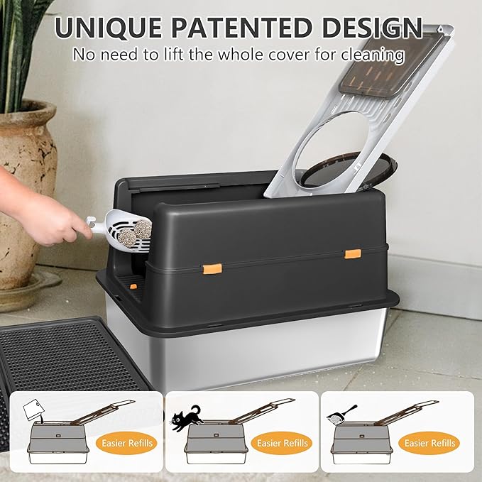 - 【180° flip-top design for easy cleaning】Tired of the hassle of cleaning enclosed cat litter box? Our flip-top stainless steel litter box features a 180° flip-top design. You can easily clean it every day without having to remove the entire top cover. Pair it with the included litter box set for a worry-free daily cleaning experience