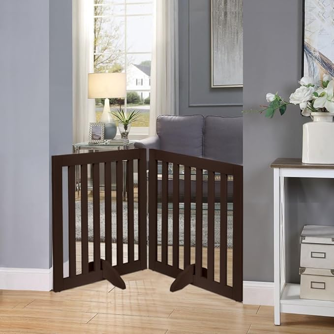 unipaws 24”H Free Standing Pet Gate for Dog Cat, Wooden Dog Gates for Doorway, Stairs, Step Over Foldable Pet Fence for The House, Expandable Doggy Barrier, Indoor Use, Espresso