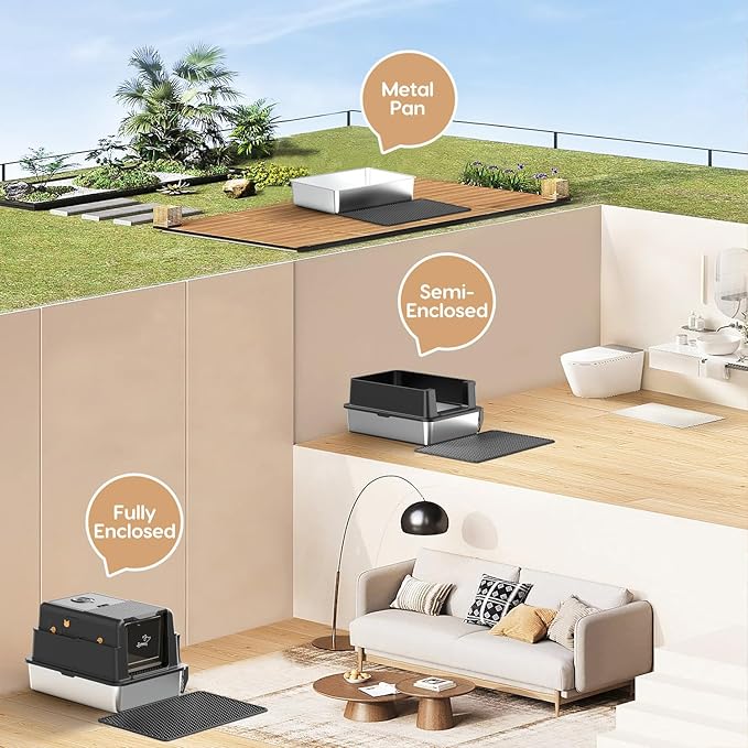 - 【3 in 1 Design + 3-Layer Assembly】The stainless steel covered cat litter box features a flip door design, making cleaning simple and effortless. Easily open the lid to clean without removing the entire cover. With an easy-to-assemble 3-layer detachable shell, it offers both fully enclosed and semi-enclosed configurations.