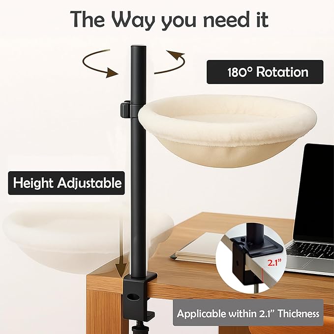 Cat Desk Bed - 360° Rotating & Height Adjustable, Cat Bed for Desk with Hammock, Sturdy Cats Bed for Desk with Removable Washable Cover, Supports Up to 50lbs, for Indoor Cats (14", Plush)