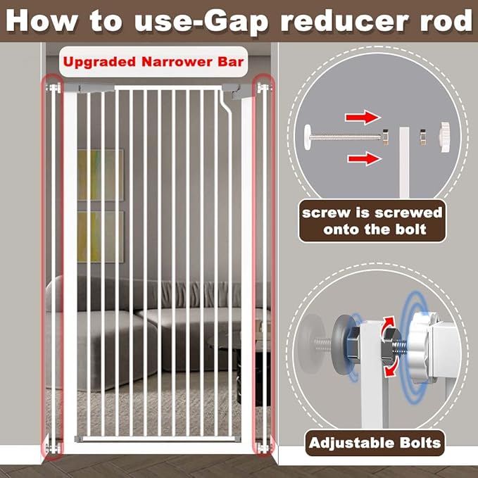 - 【Adjustable Width Design】 This metal tall pet gate features an adjustable width ranging from 48.5" to 56.2", making it suitable for various spaces, including wide living room openings, doorways, narrow hallways, and stairs. The tall dog gate indoor comes with two added reinforced rods, which enhance its stability and strength, making it ideal for both childproofing and pet-proofing your home.