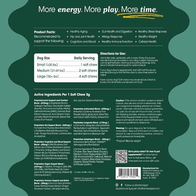 - 50% Active Ingredients – No Fillers, No Fluff: Arterra delivers 5x the actives found in most dog supplements. Made in the USA with human-grade ingredients, this is real health science — not bacon-flavored candy. Backed by our Results Guarantee.