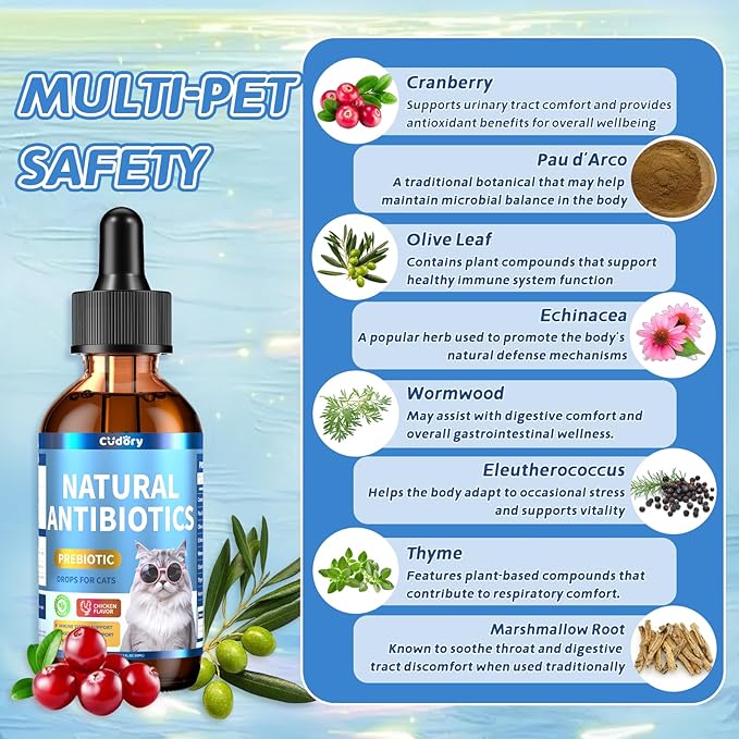 - Natural Antibiotics for Cats – Our cat natural antibiotics feature a unique blend of natural ingredients, including Cranberry, Olive leaf and Pau D’Arco, providing pets' health support. Designed to ease with common issues like seasonal discomfort, skin issue, this natural herbal formula enhances overall vitality and a cheerful mood for your furry friend.