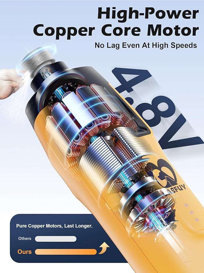 • 【4.8V Copper Core Motor - No Lag, More Power】Enhanced with 50% more torque, our powerful dog nail trimmer easily handles thick, tough nails. The durable copper core delivers smooth, stable grinding for an effortless grooming experience—even at high speeds—without stalling or slowing down.