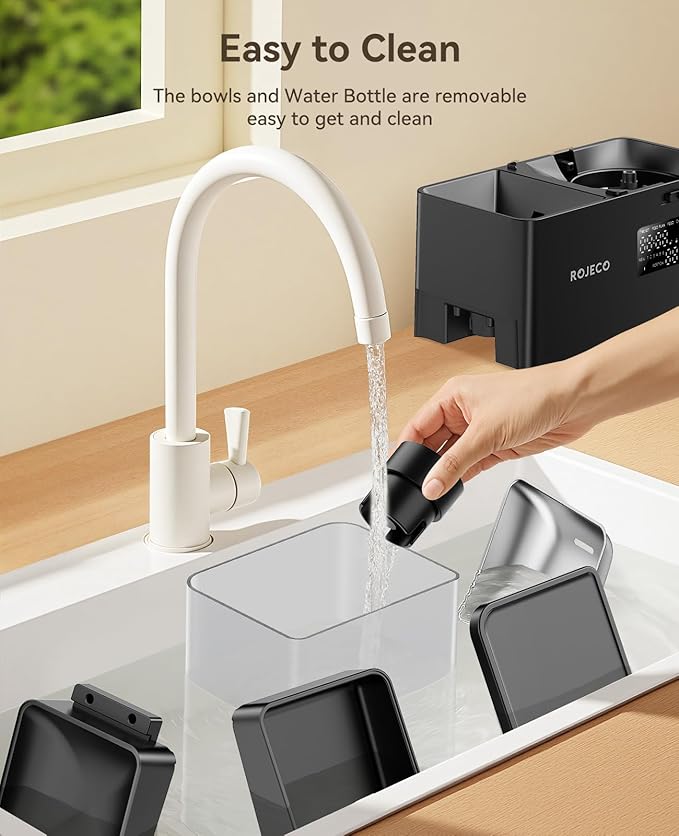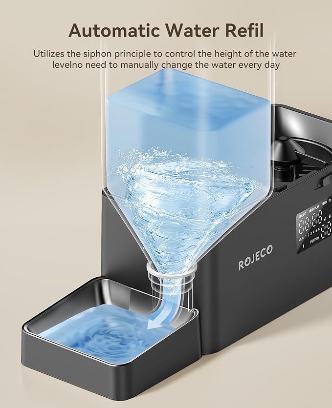 Rojeco 36Cups/8.5L Pet Automatic Cat Feeder and Gravity Water Dispenser,Stainless Steel Bowls 2-in-1 Set Large Capacity 5L Food Feeder and 3.5L Water Fountain for Cats,Pets,Small Dogs,Black