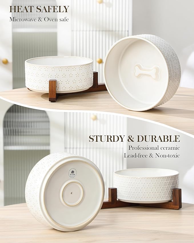 - 🦴【ELEGANT DESIGN】Featuring embossed Five-leaf Grass and Honeycomb patterns, paired with a stylish walnut wood stand for elevated dining. These ceramic dog bowls combines classic and modern styles to enhance its visual appeal. The cleverly designed dog bone-shaped decoration at the bottom adds both beauty and fun.