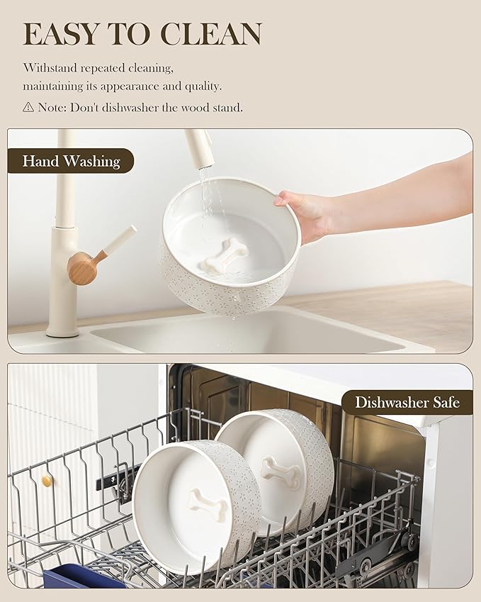 - 🦴【EASY MAINTENANCE】The ceramic bowls can be easily removed from the wooden stand for quick cleaning and convenient refilling. Featuring an active glaze finish, they are dishwasher safe and easy to clean by hand. Microwave safe as well, these bowls allow you to warm up your pet's food whenever needed.