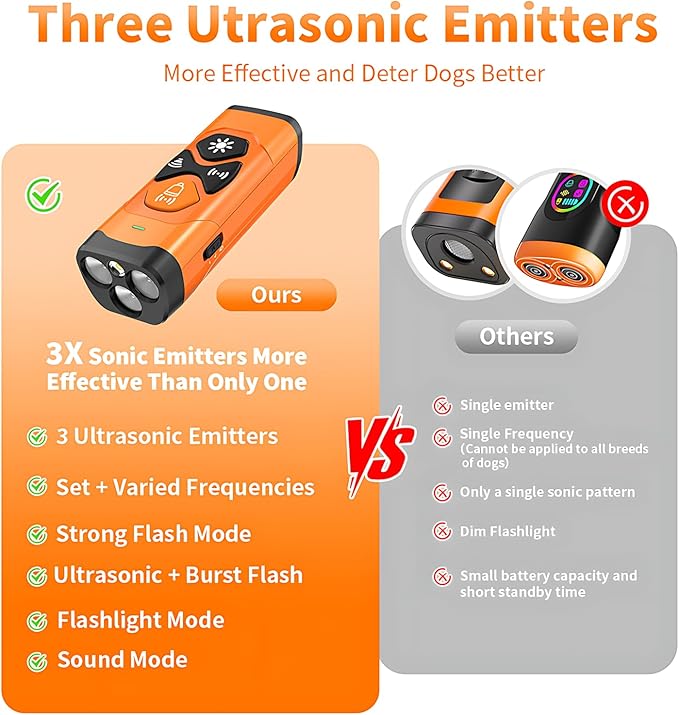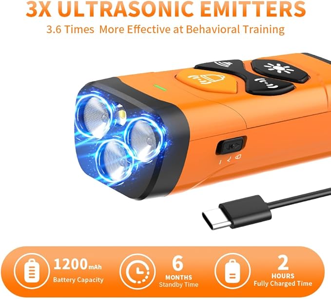 - 【3 Modes,1 Effective Result】:This dog bark deterrent device offers 3 different modes,each designed to achieve a single goal—to instantly capture your dog’s attention and discouraging unwanted behaviors. Does your dog bark,dig,chase,or chew? No more worries! You'll be amazed at how quickly and painlessly your pup responds to this innovative no-bark training device.The ultrasonic feature ensures a humane and effective training experience.