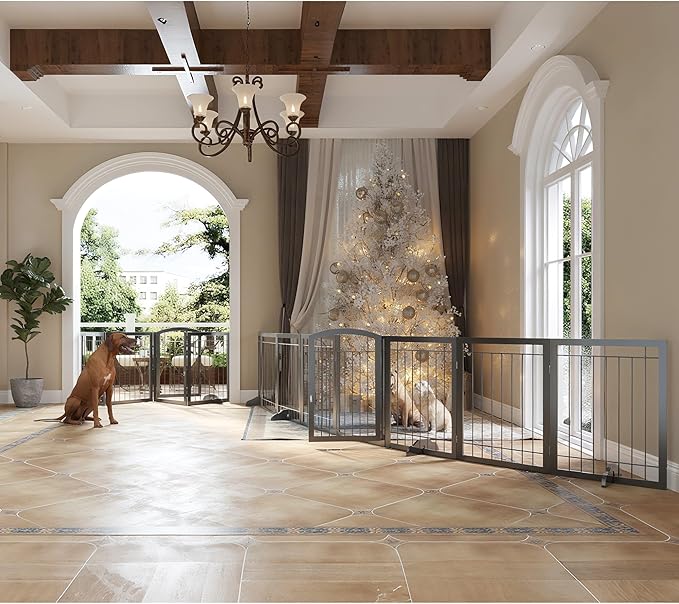 - 【SIMPLE & STURDY PET GATE】This convertible freestanding dog gate is a pet fence, room divider, and pet pen all in one.