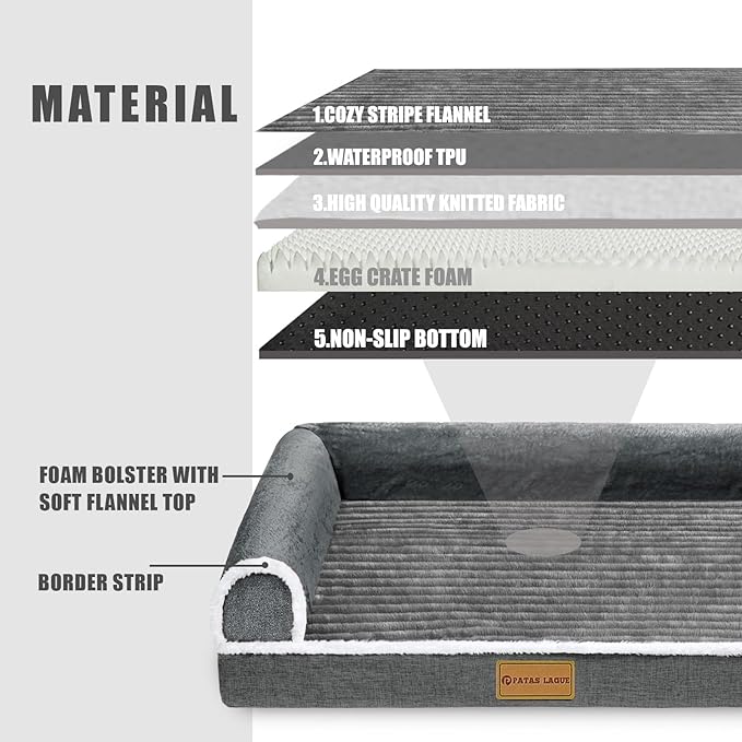 Patas Lague Orthopedic Jumbo Dog Bed Large Sized Dog 56''X40'', Waterproof Comfortable L Bolster Jumbo Non-Slip Soft Warm Pet Crate Bed Sleep Sofa mat with Removable Washable Cover, Grey