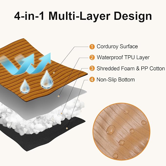 - Material : Plush Corduroy, Shredded Memory Foam & Cotton, TPU Waterproof Layer