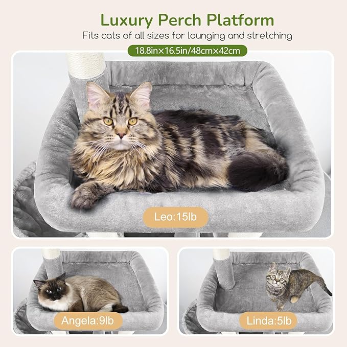 - All-round Relaxation Platform: The enlarged center platform perch is perfect for cats of all sizes to lie down and stretch out. The top floor of the big cat tree features a padded perch. Two large double-handled hanging baskets made of soft fabric and metal frame. This multi-level cat tower with scratching post provides multiple resting options, from a high overlook to a cozy nook to meet your cat's various needs