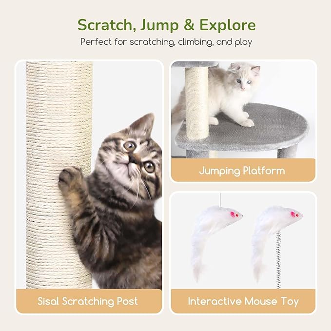 - Interactive Entertainment Center: This cat climbing tower for large cats features six natural sisal scratching posts that not only satisfy your cat's natural scratching needs but also effectively protect your furniture from damage. Additionally, the hanging and spring-loaded mouse toys stimulate your cat's hunting instincts, providing continuous entertainment and stimulation to help your cat stay active and agile