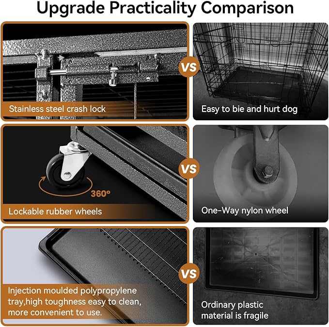 - Effortless Assembly & Quick-Clean Design:Most of the dog crate parts were pre-assembled, you just need to fit it with four wheels and six (it used to be ten) screw bolts, only takes within 5 minutes to complete. The two removable bottom pallets (a washable high grade plastic pallet and a upgrade metal pallet), make clean up more conveniently.Dog parenting can be challenging, but this crate turns those struggles into stress-free moments - your ultimate partner in creating paw-friendly routines.