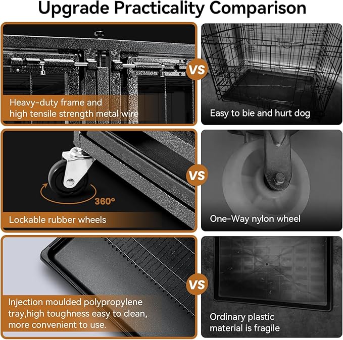 - Effortless Assembly & Quick-Clean Design:Most of the dog crate parts were pre-assembled, you just need to fit it with four wheels and six (it used to be ten) screw bolts, only takes within 5 minutes to complete. The two removable bottom pallets (a washable high grade plastic pallet and a upgrade metal pallet), make clean up more conveniently.Dog parenting can be challenging, but this crate turns those struggles into stress-free moments - your ultimate partner in creating paw-friendly routines.