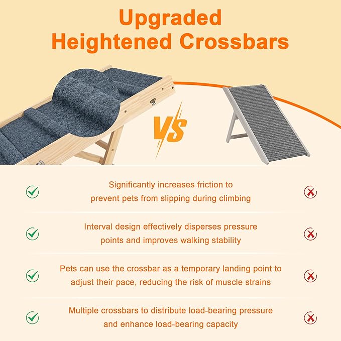 - 【Safe & Non-Slip】-Designed with pet safety in mind, this ramp for dogs to get on bed features a high traction, non-slip and abrasion-resistant gradual slope surface. The surface of the dog ramp for couch features 11 raised strips that provide a stronger grip and effectively protect your pet's knees and paws from slipping or falling while climbing.