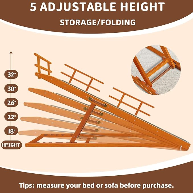 - Adjustable Height:The adjustable dog ramp has 5 height adjustments (18/22/26/30/32 inch),you can choose suitable slope for your pet.The indoor dog ramp for bed can be conveniently folded to 5.5 inches high, you can store it under the bed or small spaces