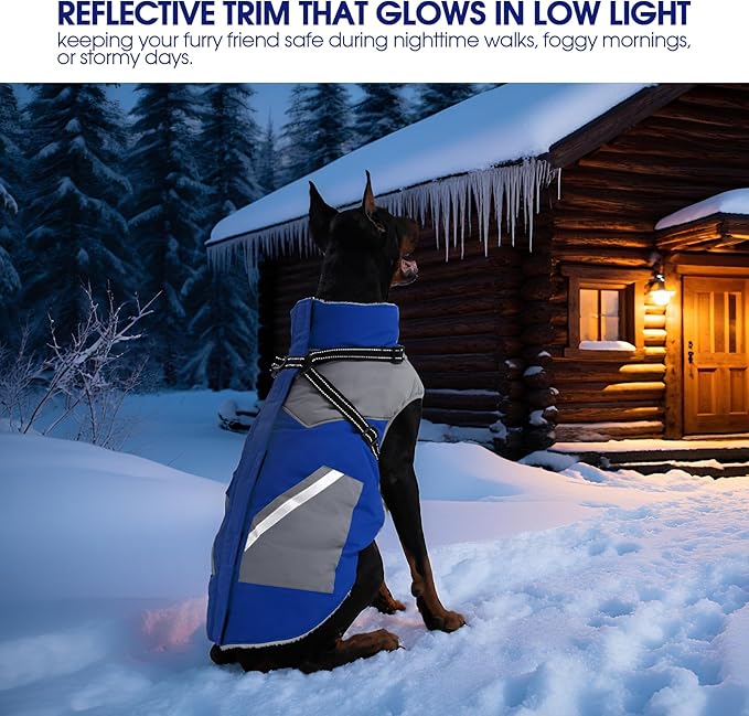 FUAMEY Dog Winter Jackets for Large Dogs,Dog Coat with Harness Built in,Waterproof Dogs Snowsuits Warm Pet Jacket Zip Up Fleece Cold Weather Coats Reflective Puppy Vest with Pocket Blue XL