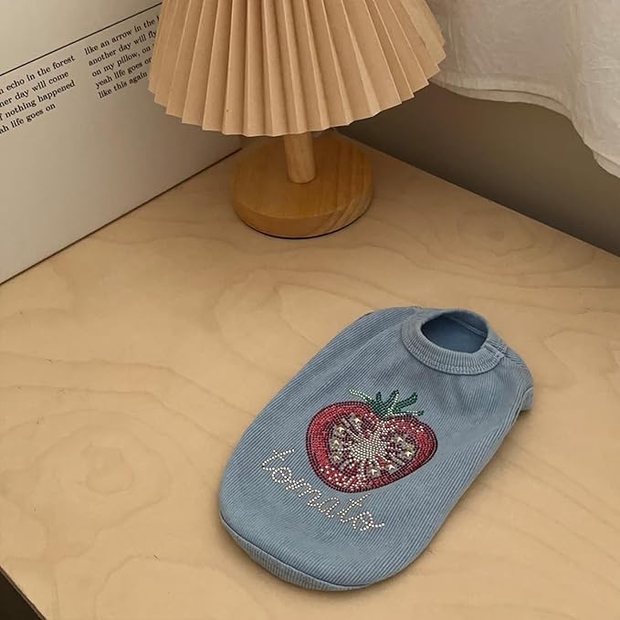 Washed Cotton Pet Vest with Rhinestone Fruit Designs, Soft & Stylish Small Dog Cat Vest for Spring Summer, Breathable & Shiny (Blue-Tomato, Large)