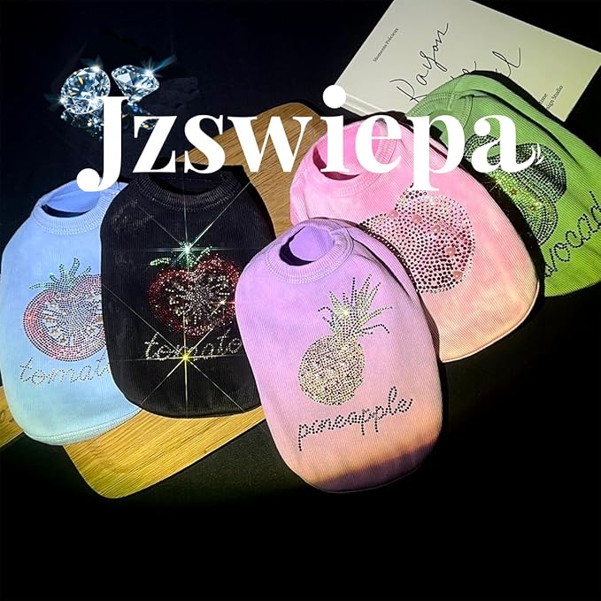 - 【Eye-Catching Rhinestone Fruit Designs & Fashionable Style】Features stunning rhinestone-embellished fruit patterns that sparkle and shine! Each vibrant color boasts a unique fruit motif (Cherry Tomato on Blue, Pineapple on Purple, Peach on Pink, Cherry Tomato on Black, Avocado on Green), adding a playful and chic touch. The overall design is trendy and elevates your pet's look with quality.