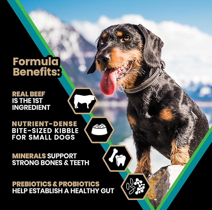 - Real Beef is the 1st ingredient- a high quality protein for lean muscle growth. Formulated to support the needs of small breeds including a nutrient-dense bite-sized kibble.