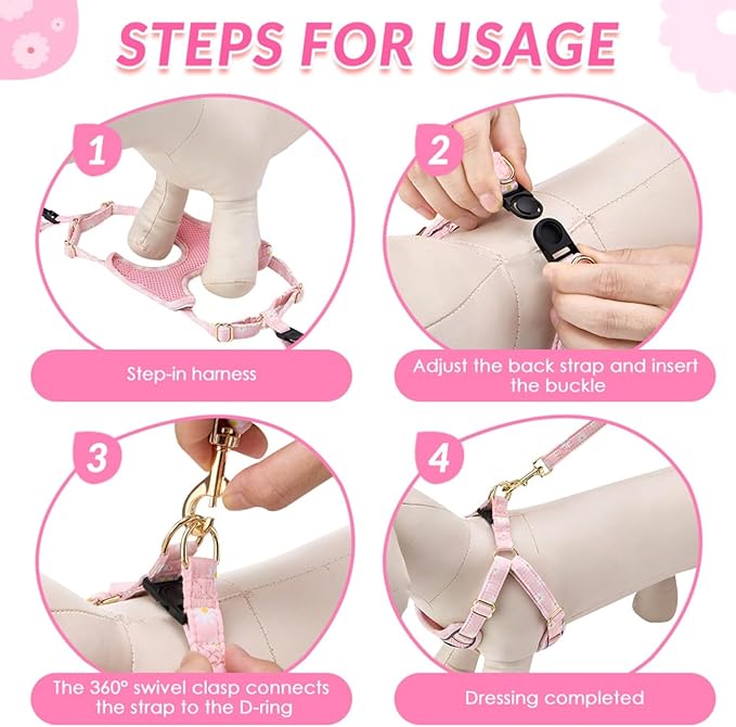 - 【Dog Harness and Leash Set 】-- SlowTon dog harness comes with a tangle-free dog leash. The 360°rotating metal buckle is durable and free of tangles. Dog harness and leash set, featuring a daisy pattern design, look chic and beautiful.