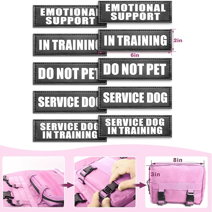 - 【Molle System】: Equipped on both sides for pouches, water bottles, and tactical dog gear. Multiple Hook & Loop Panels for morale patches and badges to showcase your dog’s personality. A wide range of use for personal service, law enforcement, hunting, or outdoor recreation. The package contains a dog harness, and 10 pieces of dog patches, such as Service dog, do not pet, in training, emotional support and service dog in training, enough quantity for you to decorate the dog’s vest harness.