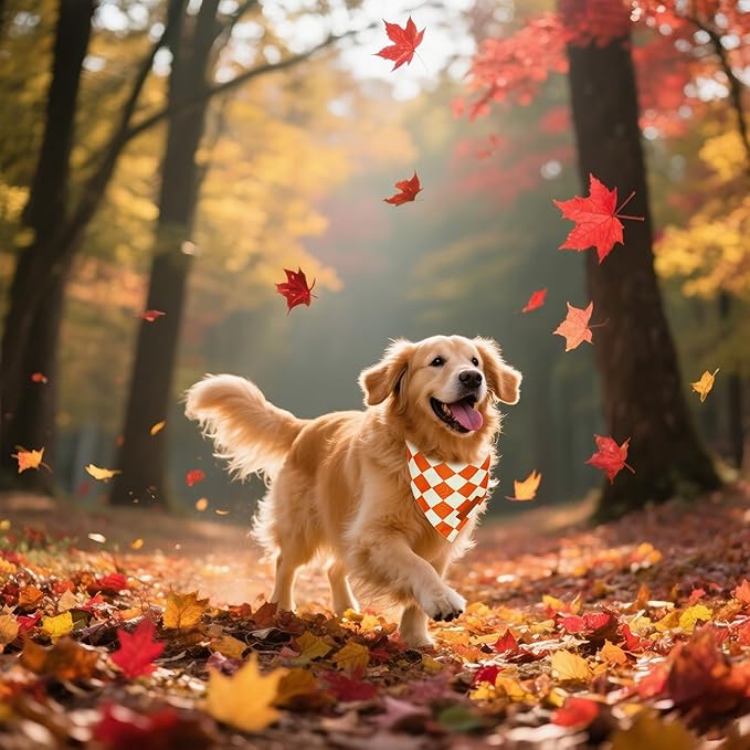 Realeaf Thanksgiving Fall Dog Bandanas 2 Pack, Orange Plaid Pumpkin Pet Scarf for Boy and Girl, Premium Durable Fabric, Holiday Halloween Bandana for Small and Medium Dogs (Fall, Small)