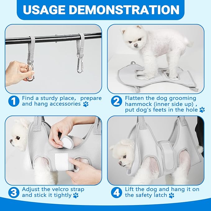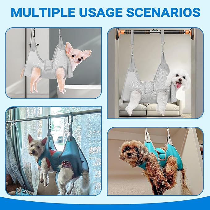 - [Easy To Operate And Practical] Simply place your dog in the hammock, adjust the anti-escape restraints, and use the safety buckle provided to lift the dog up, and you can groom or trim nails without the need to go to the groomers and the vet.
