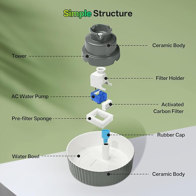 - 😽【Multi-Filtration, Water Purification】: Equipped with activated carbon filter and pre-sponge filter, which can remove sediment, debris and pet hair, this ceramic pet water dispenser can provide a constant supply of flowing purified water. Note: It is healthier to change the filter every 4 weeks!