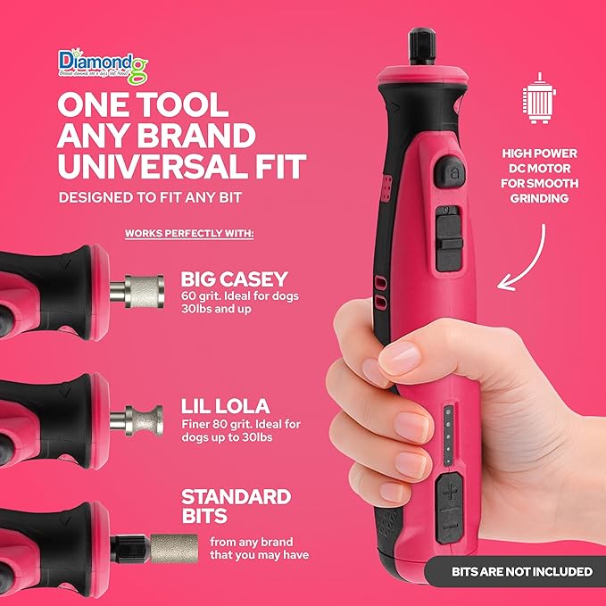 Diamondg Cordless Dog Nail Grinder with Quiet Sound & LED Tip for Large & Small Dogs, 4hrs. Runtime, 2 Bits Included, Pink