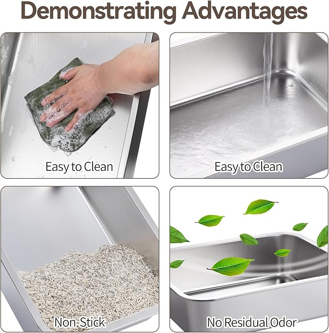 - 【Stainless Steel Material】The cat litter box is made of high-quality stainless steel, capable of withstanding long-term daily use while maintaining a perfect appearance; it also features rounded corners, eliminating sharp edges and burrs to ensure pet safety.