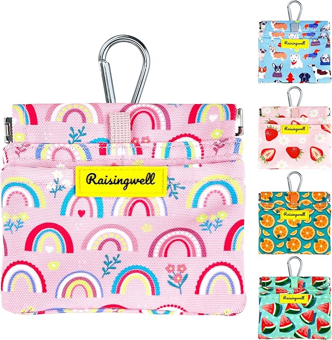 - Durable Material: Raisingwell's dog treat training pouch is crafted from durable, washable, non-toxic vegan fabric, made of pure cotton. In particular, the waterproof lining addresses the issue of difficult cleaning inside the training pouch.