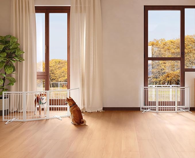 - 【Effortless Setup & Storage】Enjoy true hassle-free installation! This freestanding dog gate requires no drilling, tools, or permanent fixtures, protecting your walls and doorways. It folds down in seconds to a compact size (18" L x 1.6" W x 24" H) for easy storage and portability. Perfect as dog fences indoor for apartments, renters, or moving between rooms – it's ready to use immediately