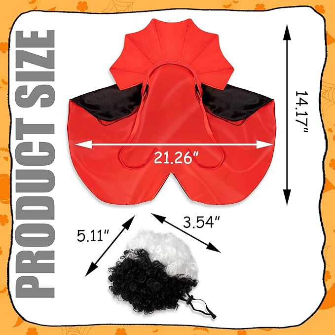 - Halloween costume for cats:You will get a set of double-sided red and black cape and wig set, the cape is 14in/36cm long, 21in/54cm wide, and the collar is 5.45in/14cm wide; the inner net size of the wig is 5.07in/13cm*3.5in/9cm. Both the cape and the wig have adjustable bindings, suitable for most dogs and cats.