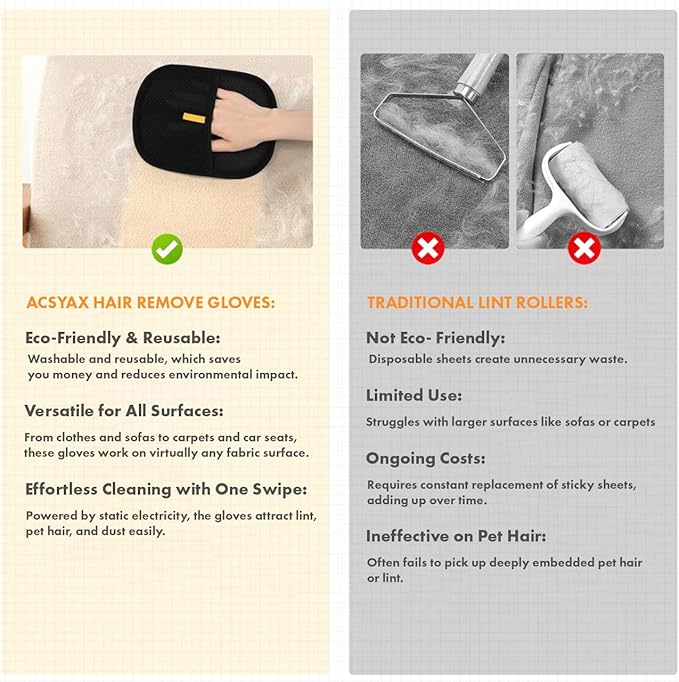 - Washable & Reusable Design – Eco-friendly electrostatic gloves replace disposable lint rollers. Washable pet hair remover mitt for sustainable cleaning & easy upkeep. Great pet hair remover for furniture and pet fur remover tool.