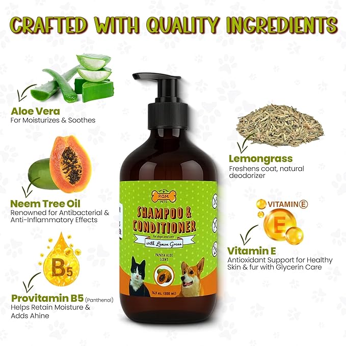 - "EASY 2-IN-1 GROOMING FOR DOGS & CATS: Simplify bath time with this convenient dog shampoo, combining cleaning and conditioning in one effective step. Perfect for busy pet parents, It works as both dog shampoo and conditioner as well as organic cat shampoo and conditioner, making it great for both dogs and cats care."
