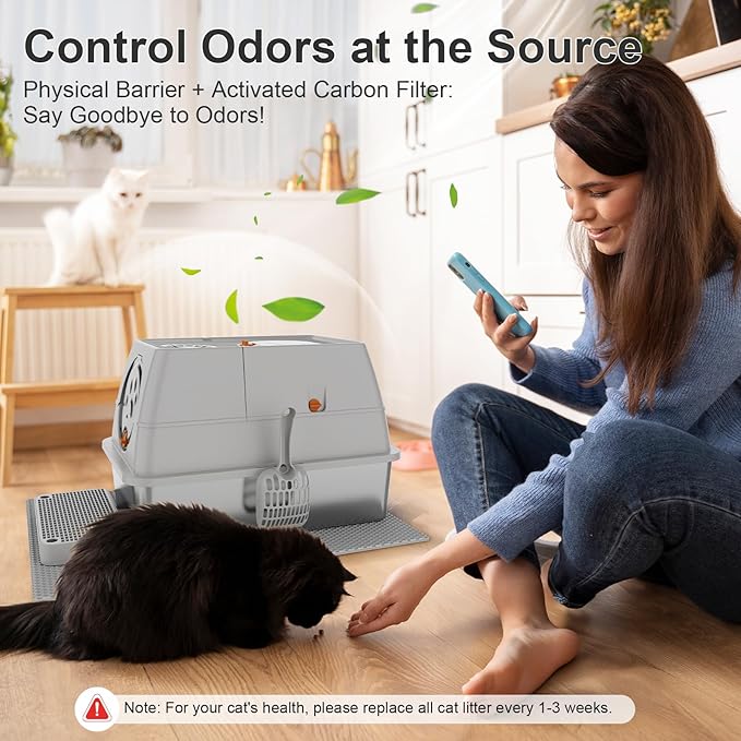 - THREE VERSATILE MODES: The large litter box adopts an easy-to-assemble 3-layer detachable shell, and is available in 3 configurations to suit various needs: fully enclosed, semi-enclosed, and open; The enclosed setup provides a private space for your cat, effectively keeping litter and odors contained, while the semi-enclosed option caters to cats preferring more open spaces and simplifies cleanup for owners