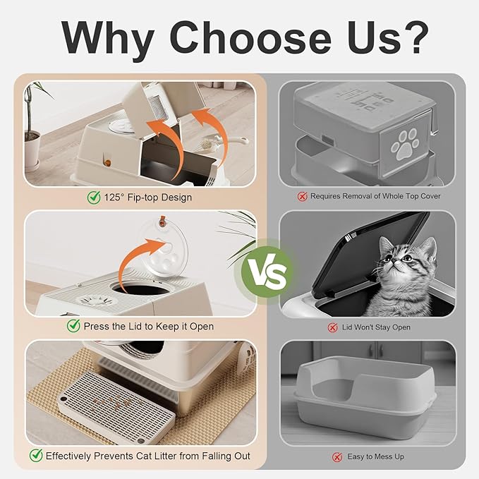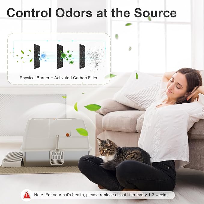 - THREE VERSATILE MODES: The large litter box adopts an easy-to-assemble 3-layer detachable shell, and is available in 3 configurations to suit various needs: fully enclosed, semi-enclosed, and open; The enclosed setup provides a private space for your cat, effectively keeping litter and odors contained, while the semi-enclosed option caters to cats preferring more open spaces and simplifies cleanup for owners