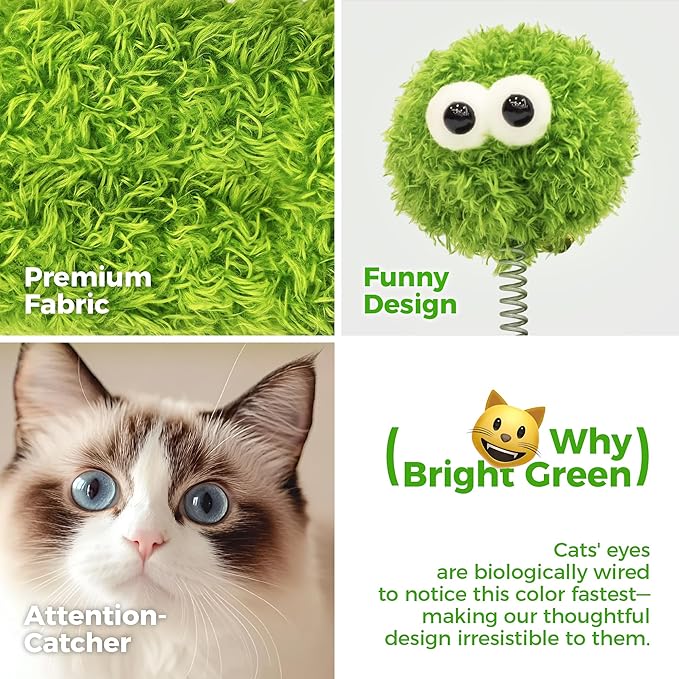 - Interactive Plush Toy Ball with Cute Eyes: The green plush ball has a spring and sound stone to boost appeal, encouraging natural hunting behaviors and energy release. Its cute eye design grabs cats' attention faster than regular toys.