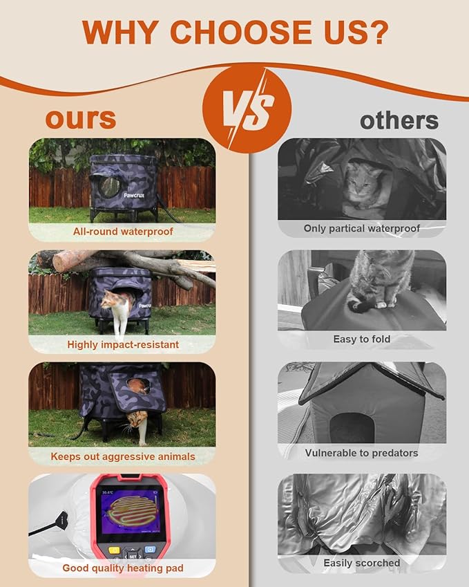 - πΎπππ πππ ππππ πππππππππ: The elevated off-ground design of this heated cat bed outdoor prevents moisture buildup at the bottom. Its cat heating pad heater outlet, eaves, roof, and escape door are all waterproof and designed to withstand wind and rain. This fully weatherproof heated cat house ensures that your catβs environment stays dry and comfortable.